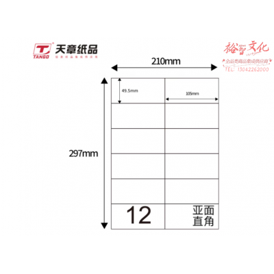 首页 > 纸及纸质品 > 纸及纸板(不包含复印纸) > 天章(TANGO)A4不干胶黄底哑面背胶纸 标签贴纸 直角12枚/张(单枚105mm*49.5mm) 80张/盒装 SKU:yzwhyp312408