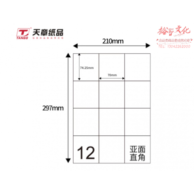 首页 > 纸及纸质品 > 纸及纸板(不包含复印纸) > 天章(TANGO)A4不干胶黄底哑面背胶纸 标签贴纸 直角12枚/张(单枚70mm*74.25mm) 80张/盒装 SKU:yzwhyp312411