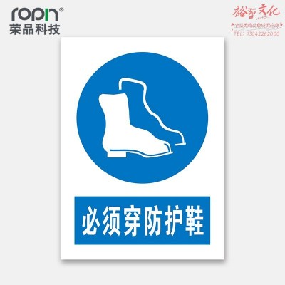 荣品 PVC国标安全警示标识牌验厂安检检查警示牌警告提示牌温馨提示标贴定制订做 必须穿防护鞋 220×300mm SKU:yzwhyp312642