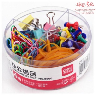 得力(deli)8500四合一办公用品组合套装 (19mm小号票夹10只+29mm回形针100只+工字钉50只+橡皮筋)/盒 SKU:yzwhyp602078