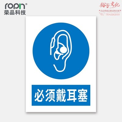 荣品 PVC国标安全警示标识牌验厂安检检查警示牌温馨提示定制订做自带背胶 必须戴耳塞 400×550mm SKU:yzwhyp312782