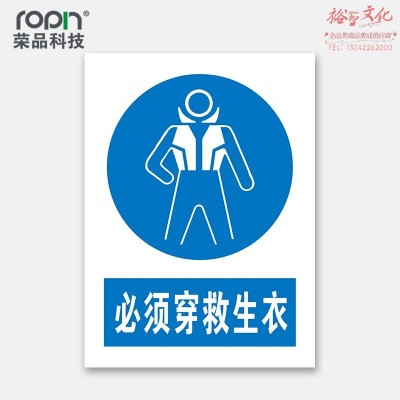 荣品 PVC国标安全警示标识牌验厂安检检查警示牌温馨提示定制订做自带背胶 必须穿救生衣 400×550mm SKU:yzwhyp312787
