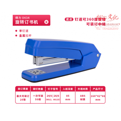 得力(deli)0434 360°旋转订书机 中缝装订 蓝色 SKU:yzwhyp602129