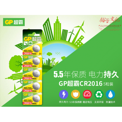 超霸(GP)CR2016进口纽扣电池电子3V适用手表摩托汽车钥匙遥控器CR2016 五粒装 SKU:yzwhyp313123