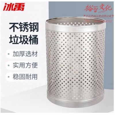 冰禹 BY-2416 不锈钢垃圾桶 办公室圆形纸篓 酒店宾馆商场无盖镂空收纳筒桶 本色 SKU:yzwhyp314285