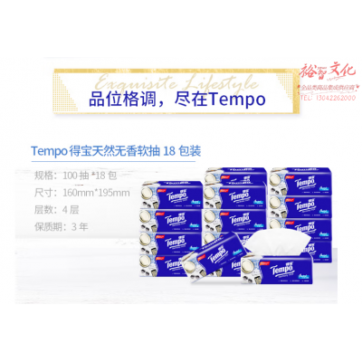 得宝(TEMPO)抽纸 无香4层加厚100抽*18包湿水不易破 纸巾 餐巾纸(箱) SKU:yzwhyp108161