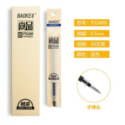 宝克(baoke) PS2490 子弹头畅滑中性笔芯 商务办公/学生考试水笔替芯 0.5mm 20支装 蓝色