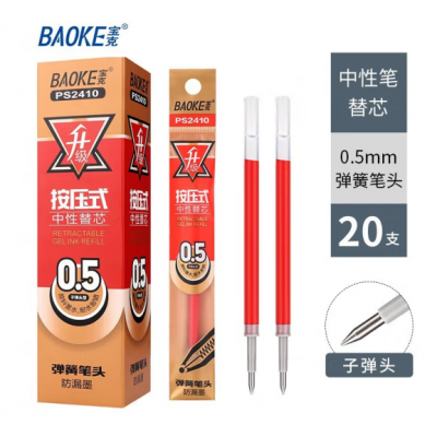 宝克(baoke) PS2410 子弹头按压式中性笔芯 商务办公/学生考试水笔替芯 0.5mm 20支装 红色