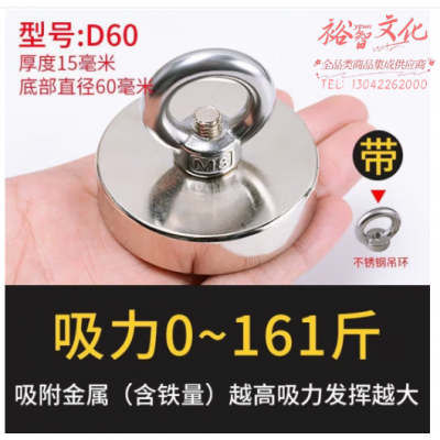 国为(COUVEZI)强磁打捞圆形磁铁吸盘大号吸铁石强吸力吊环钕磁铁户外河道打捞神器 1个装 D60打捞磁铁【直径60mm】 SKU:yzwhyp317937