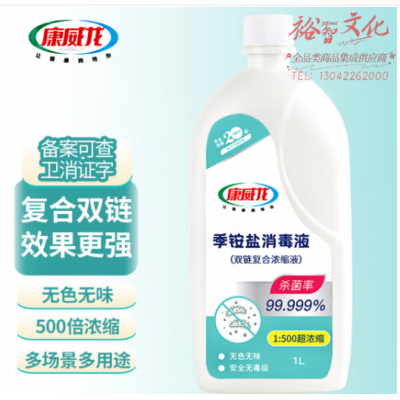 首页 > 办公用品 > 消毒杀菌用品(不包含药品、危险化学品) > 康威龙 季铵盐消毒液复合双链多用途消毒家居环境物表空气消毒1L SKU:yzwhyp110140