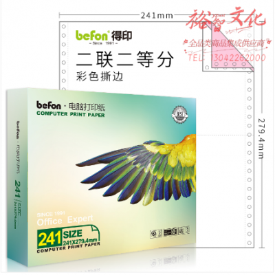 首页 > 纸及纸质品 > 纸及纸板(不包含复印纸) > 得印(befon)二联二等分打印纸 彩色 针式电脑打印纸 241-2-1/2( 80列 撕边 600页/1箱) SKU:yzwhyp319806