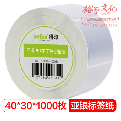 首页 > 纸及纸质品 > 纸及纸板(不包含复印纸) > 得印(befon)哑银PET标签纸 40mm*30mm*1000枚单排 亚银不干胶条码打印纸 防水pet贴纸 三防固定资产设备标签 SKU:yzwhyp319864