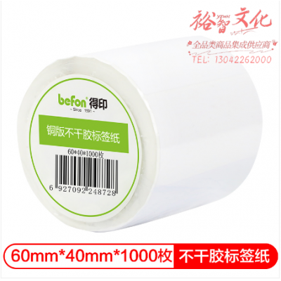 首页 > 纸及纸质品 > 纸及纸板(不包含复印纸) > 得印(befon)不干胶标签纸 铜版纸 60mm*40mm*1000枚 单排 条码纸 打印贴纸 SKU:yzwhyp319913