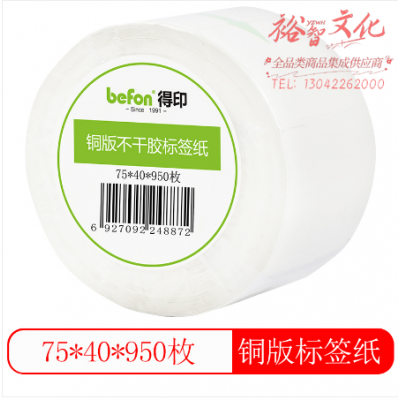 首页 > 纸及纸质品 > 纸及纸板(不包含复印纸) > 得印(befon)不干胶标签纸 铜版纸75mm*40mm 950枚 单排 条码纸 打印贴纸 SKU:yzwhyp319947