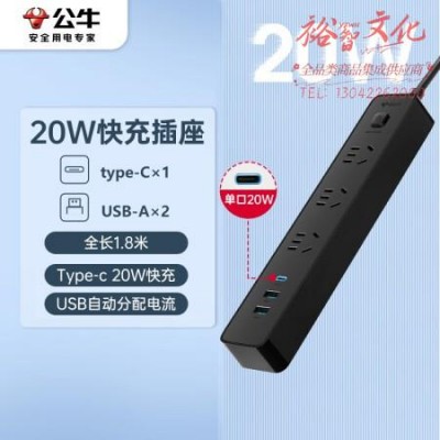 首页 > 建筑建材 > 开关插座 > 公牛(BULL)20W PD苹果快充插座/插线板/插排/接线板 Type-c口+USB口+3插孔 全长1.8米黑色 GNV-UU4203 SKU:yzwhyp320124