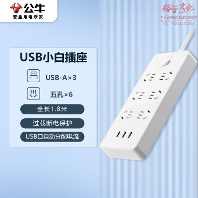 公牛(BULL)超功率保护 新国标公牛小白USB插座/插线板/插排/排插 GNV-UUN153 3usb接口 6孔全长1.8米 SKU:yzwhyp320138