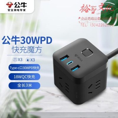 首页 > 建筑建材 > 开关插座 > 公牛(BULL)30WPD苹果快充魔方插座/插线板/插排/接线板 Type-c口+USB口+3插孔 全长3米黑色 GNV-UU2303H SKU:yzwhyp320216