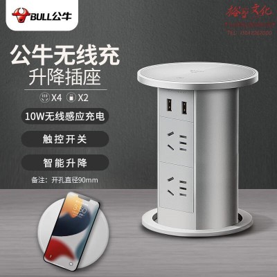 公牛(BULL)无线充 电动智能升降/隐藏式/嵌入式/多功能插座4位五孔+2USB+10W感应充电 银色 SKU:yzwhyp320682