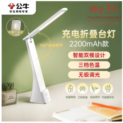 公牛(BULL)折叠台灯学生床头带小夜灯ML-B220A-DS无极调光充插两用2200mAh SKU:yzwhyp321021