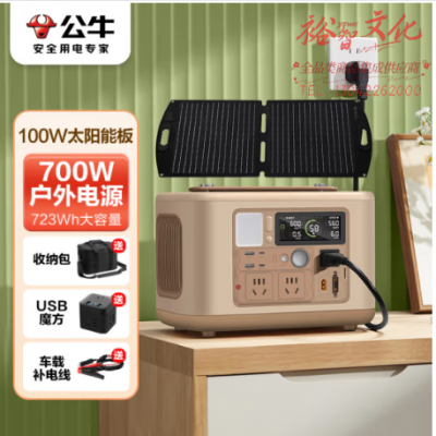 公公牛快充户外移动电源700W 暮光橙 +太阳能板 笔记本充电宝自驾露营摆摊220V储能电源应急停电备用 SKU:yzwhyp321083