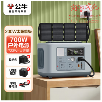 公牛快充户外移动电源700W 晴空蓝 +200W太阳能板 笔记本充电宝自驾露营摆摊220V储能电源应急停电备 SKU:yzwhyp321085