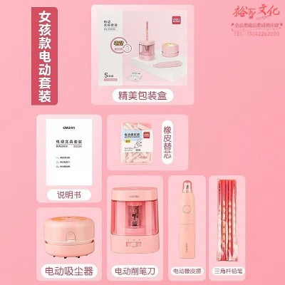 得力33303A电动文具套装5件套 铅笔橡皮擦橡皮削笔刀桌面吸尘器套装 公主粉(套) SKU:yzwhyp322509