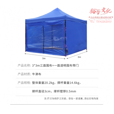 户外遮阳棚隔离帐篷 四角伞折叠雨棚摆摊用防晒救灾遮阳蓬 3*3m三面围布+一面透明围布带门带拉链 SKU:yzwhyp325838