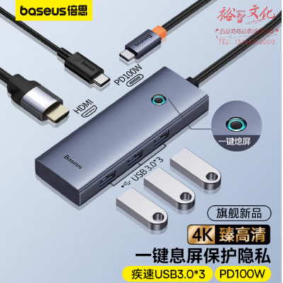 倍思 五合一Type-C扩展坞*1(HDMI4K*1+USB3.0*3+PD*1)4K高清投屏USB3.0/PD100W SKU:yzwhyp111934