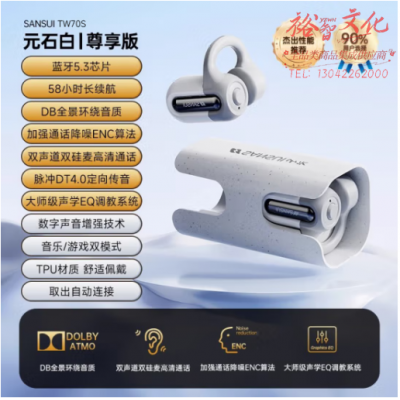 首页 > 广播、电视、电影设备 > 组合音像设备 > 会议、广播及音乐欣赏系统 > 山水(SANSUI)TW70S 骨传导概念蓝牙耳机 气传导开放式无线夹耳耳夹式不入耳运动跑步通话降噪适用于华为苹果 白 SKU:yzwhyp327278
