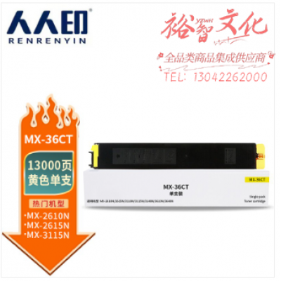 首页 > 办公用品 > 墨粉盒 > 人人印 MX-36CT黄色粉盒 适用夏普SHARP MX-2618NC 3118NC 3618NC 2648NC 3148NC 3648NC墨盒 墨粉盒 碳粉 SKU:yzwhyp802844