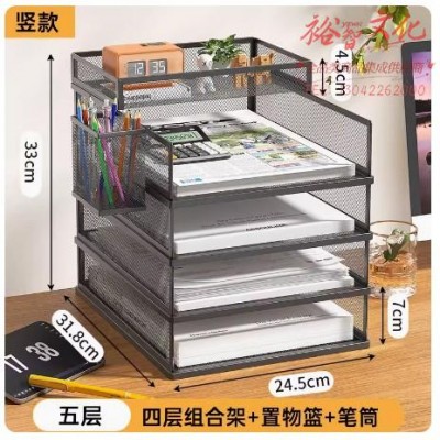 桌面文件架金属资料架文件框多层文件收纳架 A4五层(竖黑带侧网四层组合架+置物篮+笔筒 SKU:yzwhyp803121
