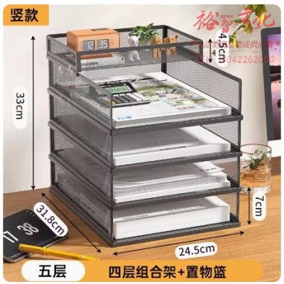 桌面文件架金属资料架文件框多层文件收纳架 A4五层(竖黑带侧网四层组合架+置物篮) SKU:yzwhyp803126