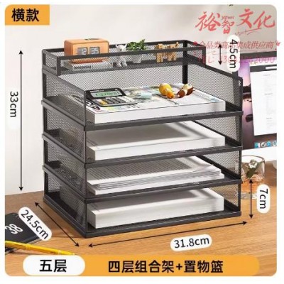 桌面文件架金属资料架文件框多层文件收纳架 A4五层(横黑带侧网四层组合架+置物篮)+笔筒 SKU:yzwhyp803138