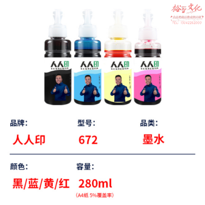 首页 > 办公用品 > 墨水 > 人人印爱普生672打印机墨水70ml黄色 SKU:yzwhyp803184