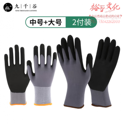 九千谷1398 园艺手套 花艺插花劳保防护加厚加密尼龙手套家用防水耐磨防刺拔草种植专用 大+中号2付装 SKU:yzwhyp803387