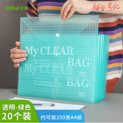天顺 文件袋按扣袋 塑料收纳袋A4 透明网格款绿色209A 20个装 SKU:yzwhyp805370
