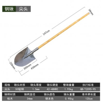 加厚大铁锹锰钢加厚铁铲子户外挖土松土种花园艺工具农用铁锨(带柄钢色尖型锹)