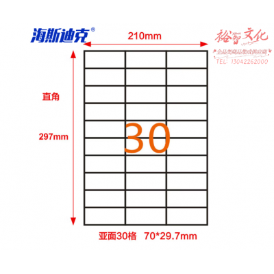 海斯迪克 HKLY-97 亚光a4不干胶 库房货位打印纸 标签纸 30格70*29.7mm 80张直角 SKU:yzwhyp806964