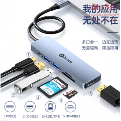 毕亚兹 Type-C扩展坞 usb-c转hdmi转接头 带读卡器六合一 R57-6口 SKU:yzwhyp808344