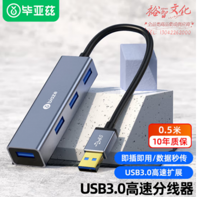 毕亚兹 USB3.0分线器 高速扩展一拖四多接口HUB扩展0.5米 HUB2-灰 SKU:yzwhyp808373