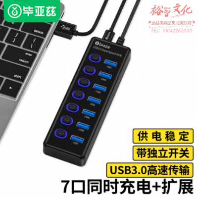 毕亚兹 USB3.0分线器 一拖七口高速扩展坞独立开关 工业级7口HUB带供电口拓展坞 HUB52 SKU:yzwhyp809175