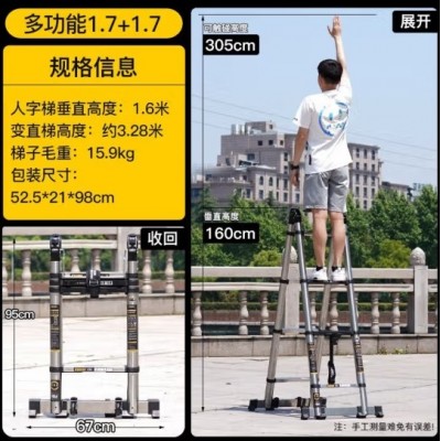 首页 > 建筑建材 > 五金附件 > 【大关节加宽踏板】多功能伸缩梯子1.7+1.7=3.4(不锈钢款)