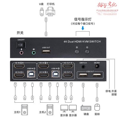 毕亚兹 HDMI KVM切换器2进2出带外置按键 显卡扩展双屏幕二进二出高清4KSKU:yzwhyp811229