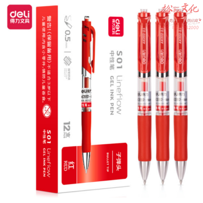 得力 S01中性笔 红色 中性笔签字笔 0.5mm子弹头 按动笔水笔 红色 12支/盒 (单位:支)SKU:YZB100060