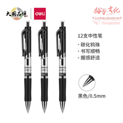 得力/deli S01中性笔 中性笔签字笔 0.5mm子弹头 经典办公 按动笔水笔 黑色 12支/盒SKU:YZB100606