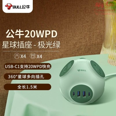 首页 > 建筑建材 > 开关插座 > 公牛(BULL)20W PD苹果快充星球插座/插线板/插排/排插/拖线板 球型 4个五孔 4个USB GNV-U1204Q 极光绿SKU:yzwhyp818784