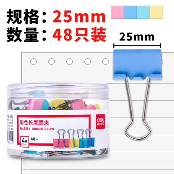 得力(deli)25mm彩色长尾夹票夹 8554 4#金属燕尾夹票据夹子 48只/筒 WLSZ01031606258281SKU:yzwhyp822477