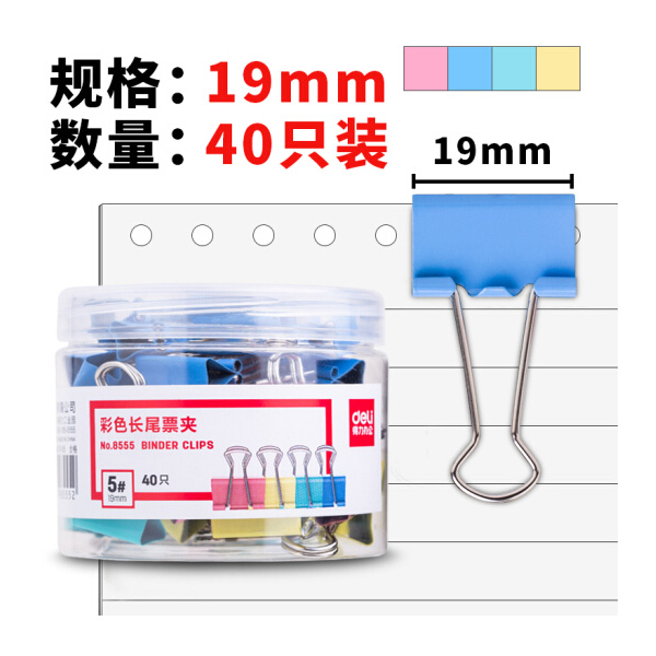 得力 8555 彩色长尾夹 19mm (40只/筒) WLSZ01021519191628SKU:yzwhyp822494