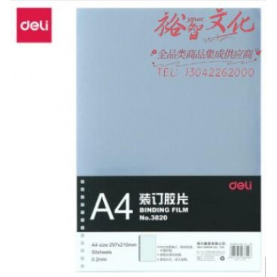 得力(deli) A4装订胶片 透明PVC胶片 打孔装订封面纸 塑料装订封皮装订胶片(50张/包) 3820 SKU:yzwhyp824284