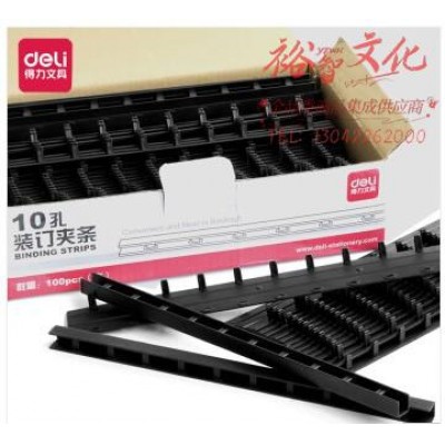 得力(deli)10孔装订夹条A4塑料十孔标书文件装订机夹边条 100支/盒 装订厚度10mm 约100页左右 3827 黑色SKU:yzwhyp824285